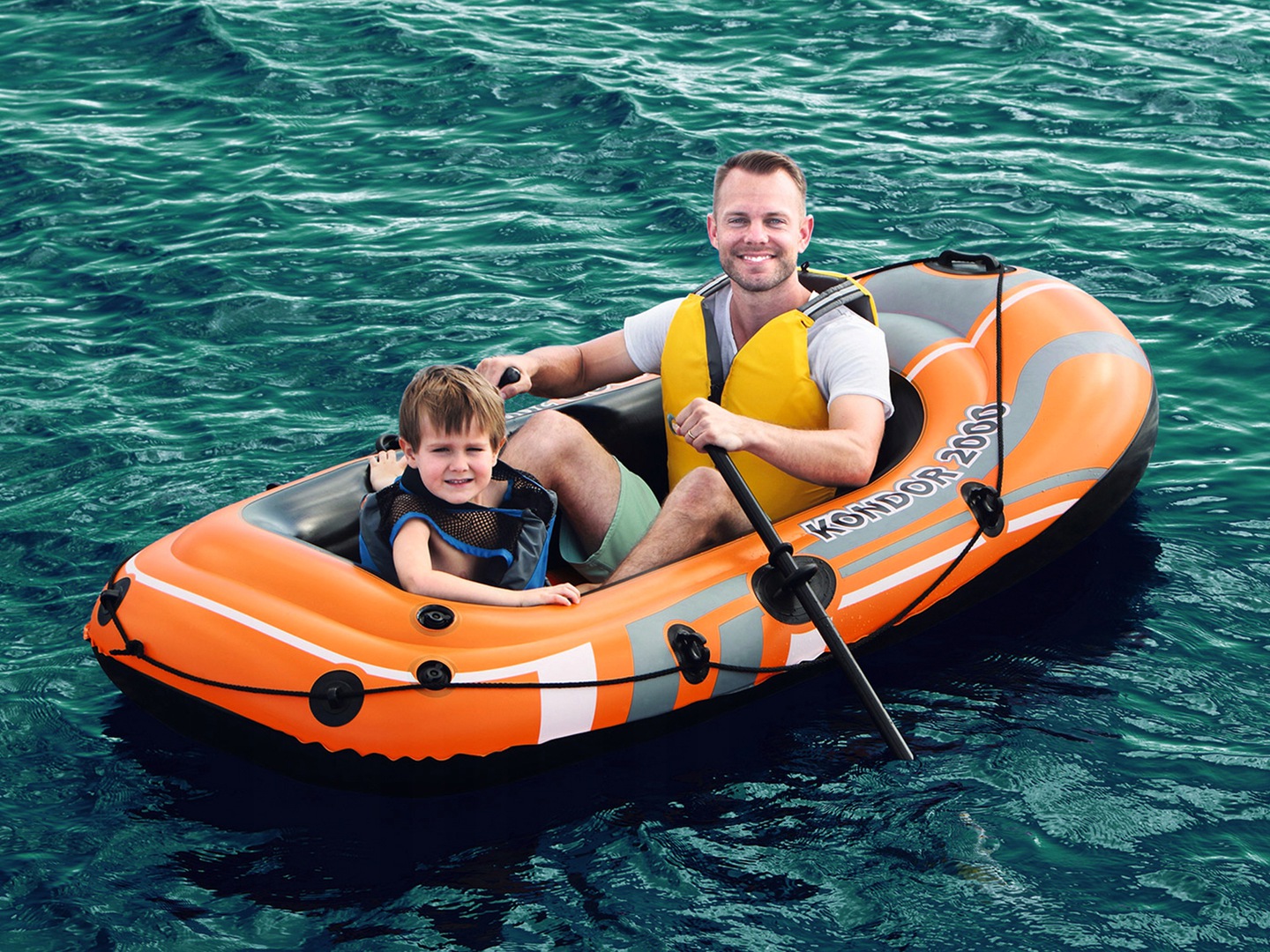 Produkt wykonany z trwałego tworzywa PVC, wyposażony jest w zestawie w parę wioseł z tworzywa oraz pompkę nożną. Ponton posiada wygodną dmuchaną podłogę, która uprzyjemni morskie wyprawy.